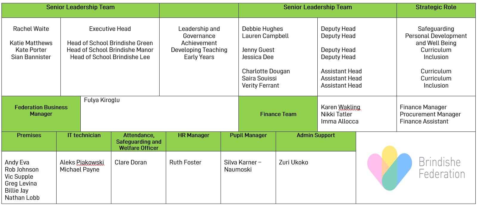 As a Federation of Schools, we work very closely as a team to secure the best for all our children. A number of staff work across the three schools to allow this to be achieved.